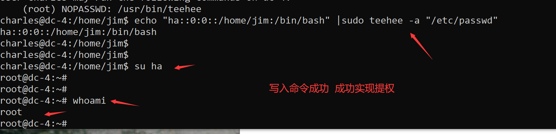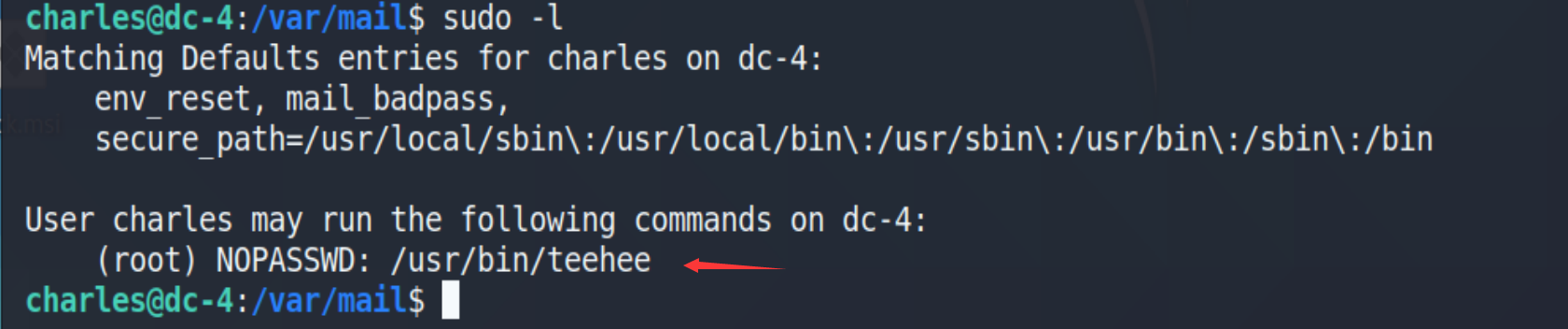在ssh登录成功以后 我们sudo -l可以查看到teehee下免密码可以执行root权限 并且teehee可以把字段附加到文本末尾