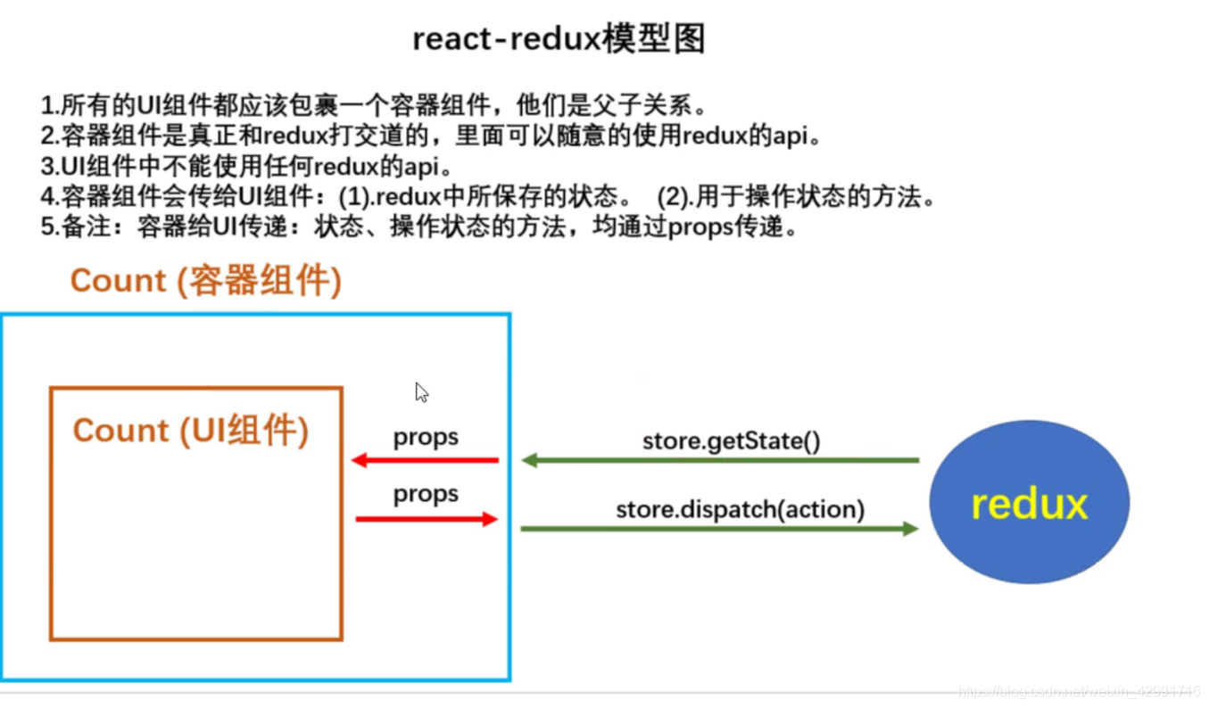 - 备注1:容器组件中的store是靠props传进去的,而不是在容器组件中直接引入
