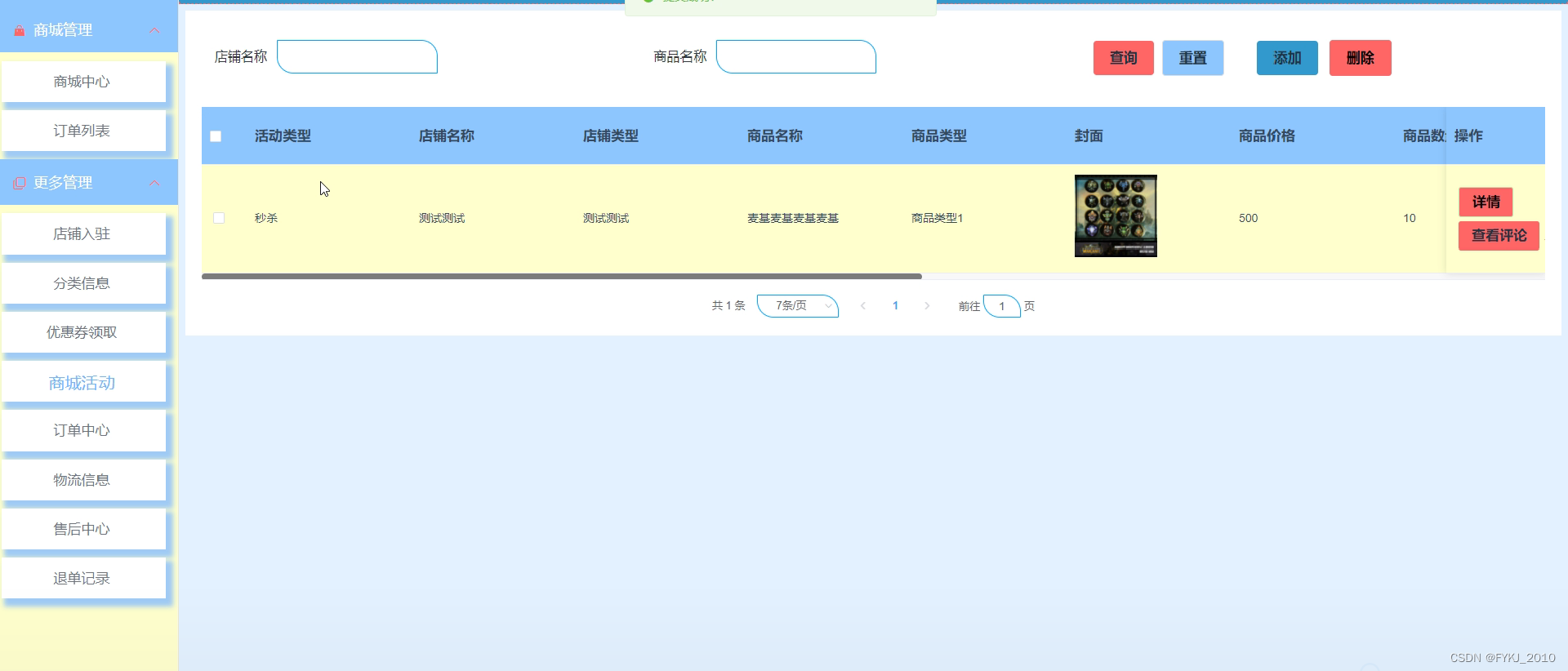 (6)商城活动模块:主要是商城活动信息展示,具体包括店铺名称、活动类型、商品名称、商品类型、商品数量、商品价格。