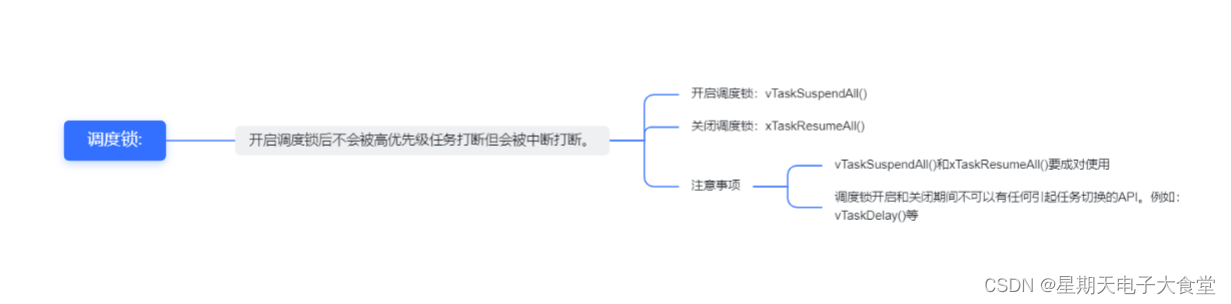 2,调度锁开启和关闭期间不可以有任何引起任务切换的API。例如:vTaskDelay()等