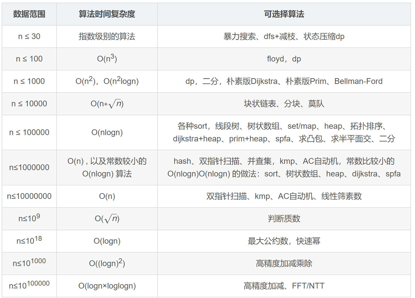 下面给出在不同数据范围下,代码的时间复杂度和算法该如何选择: