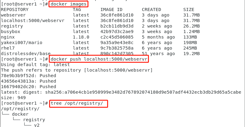 [root@server1 ~]# docker run -d --name registry -p 5000:5000 -v /opt/registry:/var/lib/registry registry