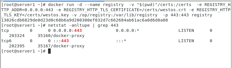 [root@server1 ~]# docker run -d --name registry -v "$(pwd)"/certs:/certs -e REGISTRY_HTTP_ADDR=0.0.0.0:443 -e REGISTRY_HTTP_TLS_CERTIFICATE=/certs/westos.crt -e REGISTRY_HTTP_TLS_KEY=/certs/westos.key -v /op/registry:/var/lib/registry -p 443:443 registry