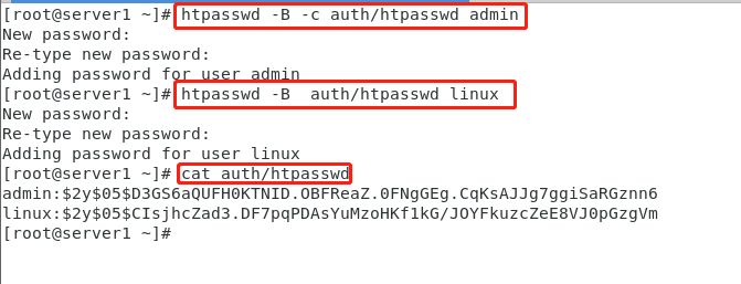 [root@server1 ~]# htpasswd -B auth/htpasswd linux ## c 表示第一次创建