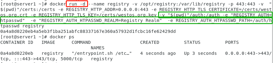 [root@server1 ~]# docker run -d --name registry -v /opt/registry:/var/lib/registry -p 443:443 -v "$(pwd)"/certs:/certs -e REGISTRY_HTTP_ADDR=0.0.0.0:443 -e REGISTRY_HTTP_TLS_CERTIFICATE=/certs/westos.org.crt -e REGISTRY_HTTP_TLS_KEY=/certs/westos.org.key -v "$(pwd)"/auth:/auth -e "REGISTRY_AUTH=htpasswd" -e "REGISTRY_AUTH_HTPASSWD_REALM=Registry Realm" -e REGISTRY_AUTH_HTPASSWD_PATH=/auth/htpasswd registry