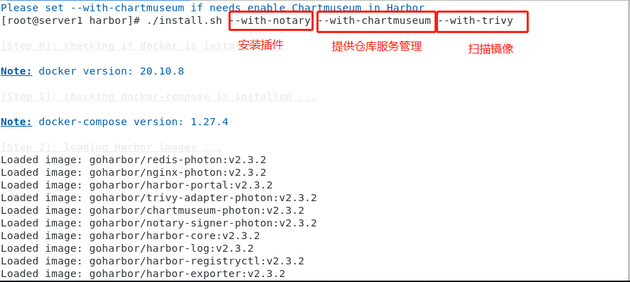 [root@server1 harbor]# ./install.sh --with-notary --with-chartmuseum --with-trivy