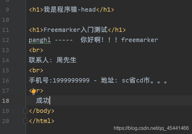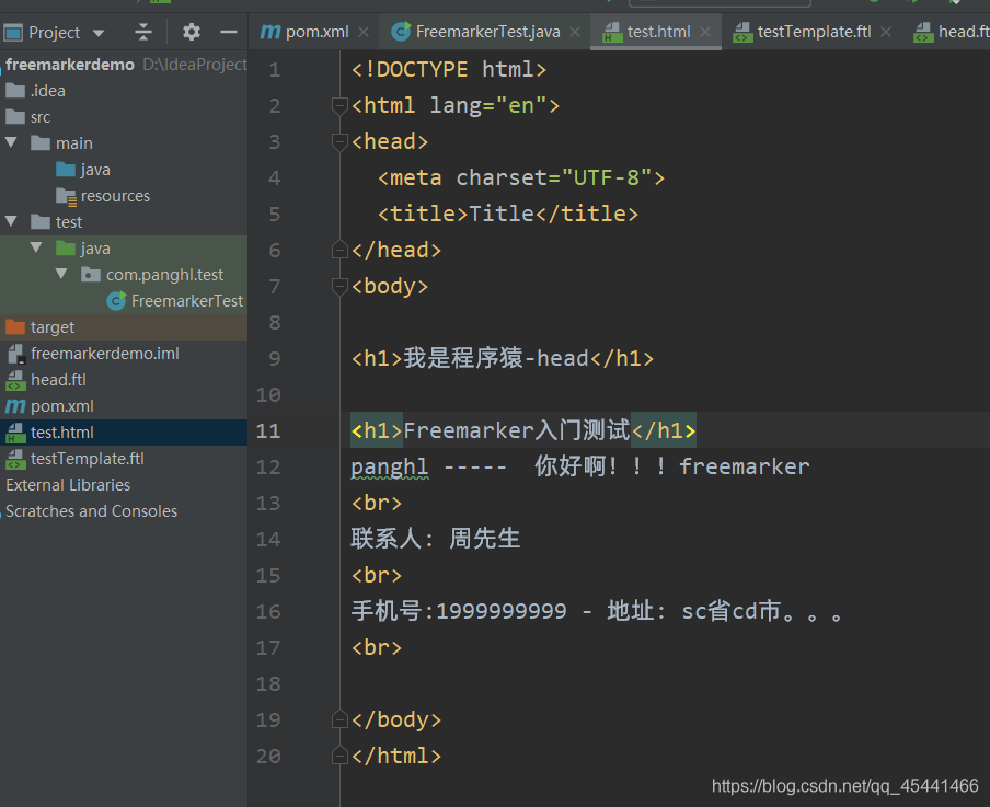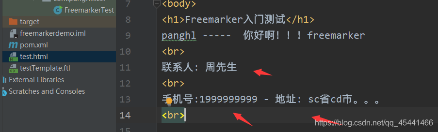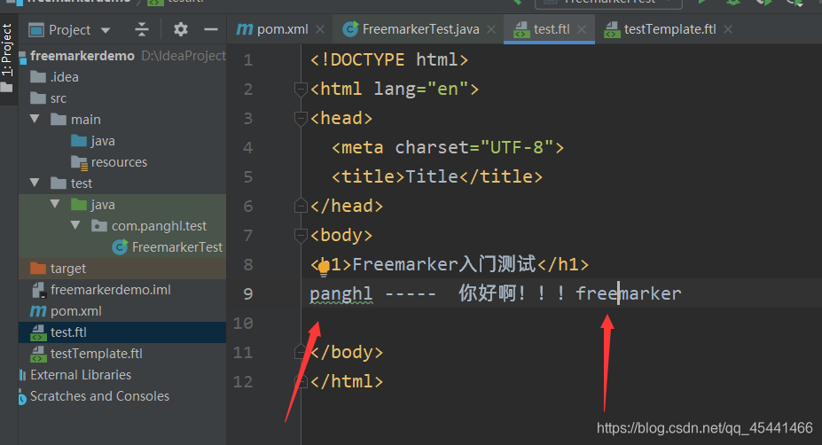 在当前项目目录下创建名称为testTemplate.ftl的模板文件,内容如下: