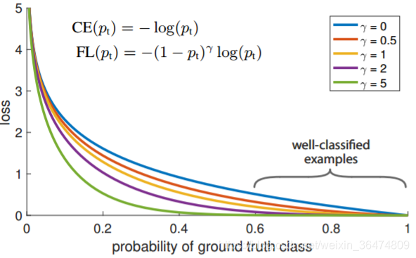 focal loss在交叉熵预测的概率前多了一个指数,从而使得预测的时候,gamma>0使得减少易分类样本的损失(注意gama和y不一样)。使得更关注于困难的、错分的样本。