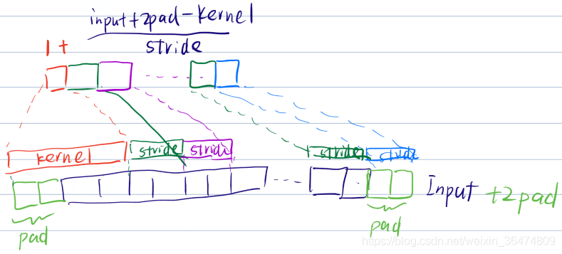 简化的:output=(input+2*pad-kernel)/stride)+1