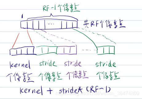 - RF中除了一个像素点之外的(RF-1)个像素点,这些像素点每个都在下一层区域多感受stride个像素