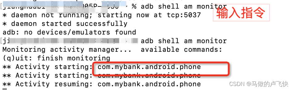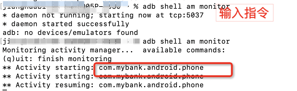 1.输入指令adb shell am monitor ,再启动已连接设备上需要获取包名的程序