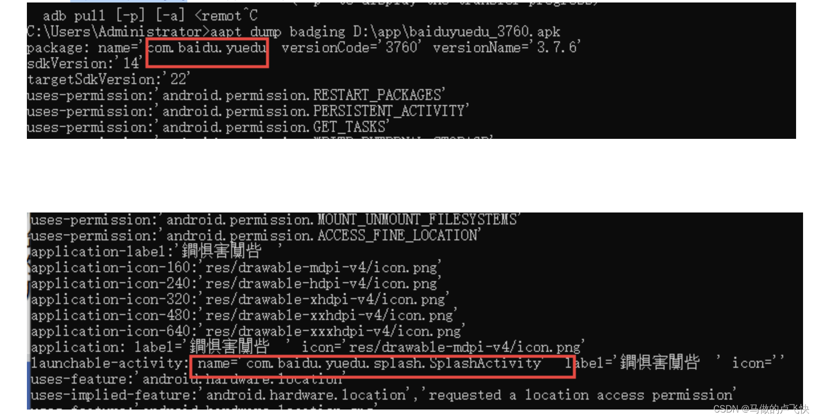 aapt dump badging + 绝对路径(如D:\app\baiduyuedu_3760.apk)