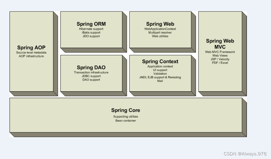 - 目的:提供一种贯穿始终的解决方面,将各种专用框架整合成一个连贯的整体框架,简化企业级应用的开发(有点像粘合剂)