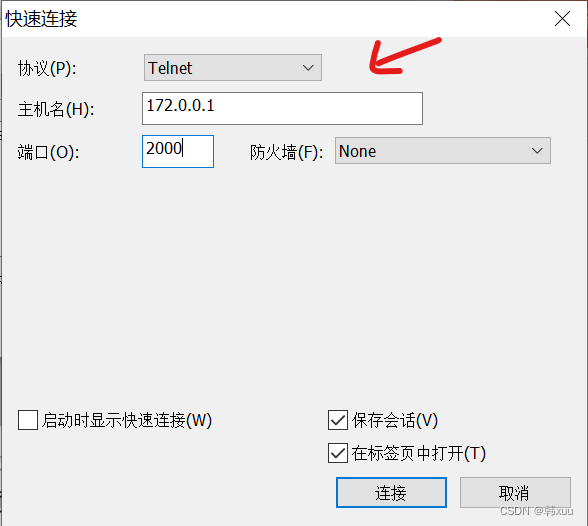 第二步:选择Telnet协议,输入需要连接的主机和端口号,点击连接