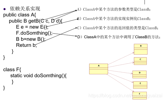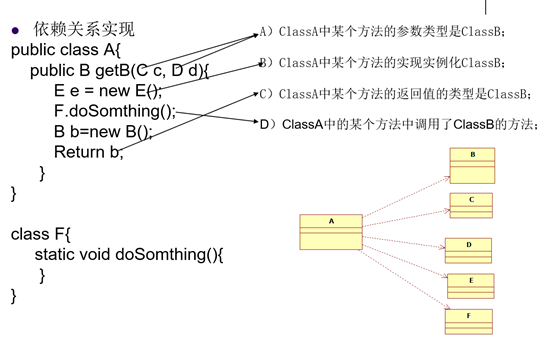 理解:类一个甲使用到了另一个类B,B类的变化会影响到A.使用这种关系的英文单向的,临时的,非结构化的,英文的并且最弱的一种关系。