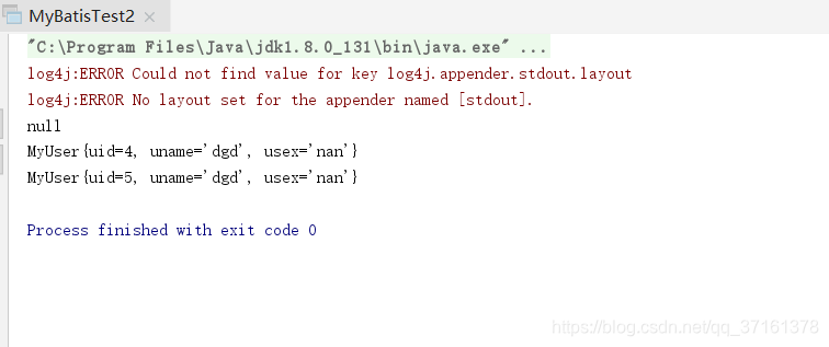 </mapper>package com.ssm.web.model; public class MyUser { private Integer uid; private String uname; private String usex; @Override public String toString() { return "MyUser{" + "uid=" + uid + ", uname='" + uname + '\'' + ", usex='" + usex + '\'' + '}'; } public Integer getUid() { return uid; } public void setUid(Integer uid) { this.uid = uid; } public String getUname() { return uname; } public void setUname(String uname) { this.uname = uname; } public String getUsex() { return usex; } public void setUsex(String usex) { this.usex = usex; } }package com.ssm.Test; import com.ssm.web.model.MyUser; import org.apache.ibatis.io.Resources; import org.apache.ibatis.session.SqlSession; import org.apache.ibatis.session.SqlSessionFactory; import org.apache.ibatis.session.SqlSessionFactoryBuilder; import java.io.IOException; import java.io.InputStream; import java.util.List; public class MyBatisTest2 { public static void main(String[]args){ try { InputStream config= Resources.getResourceAsStream("mybatis-config.xml"); SqlSessionFactory ssf=new SqlSessionFactoryBuilder().build(config); SqlSession ss=ssf.openSession(); MyUser mu=ss.selectOne("com.ssm.mapper.UserMapper.selectUserById",1); System.out.println(mu); MyUser addmu=new MyUser(); addmu.setUname("dgd"); addmu.setUsex("nan"); ss.insert("com.ssm.mapper.UserMapper.addUser",addmu); MyUser updatemu=new MyUser(); updatemu.setUid(1); updatemu.setUname("张"); updatemu.setUsex("女"); ss.update("com.ssm.mapper.UserMapper.updateUser",updatemu); ss.delete("com.ssm.mapper.UserMapper.deleteUser",3); List<MyUser>list=ss.selectList("com.ssm.mapper.UserMapper.selectAllUser"); for (MyUser myUser:list){ System.out.println(myUser); } ss.commit(); ss.close(); }catch (IOException e){ e.printStackTrace(); } } }