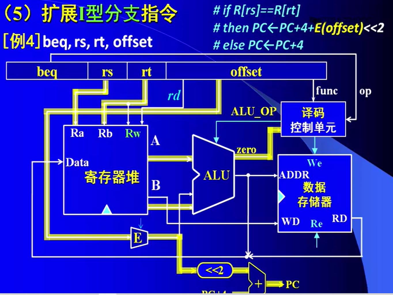 4、在添加I型分支运算if(rs == rt) PC<- PC + 4 + E(offset) << 2 else PC<- PC + 4;