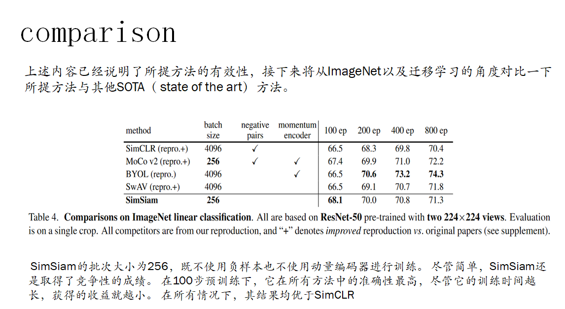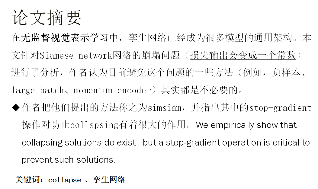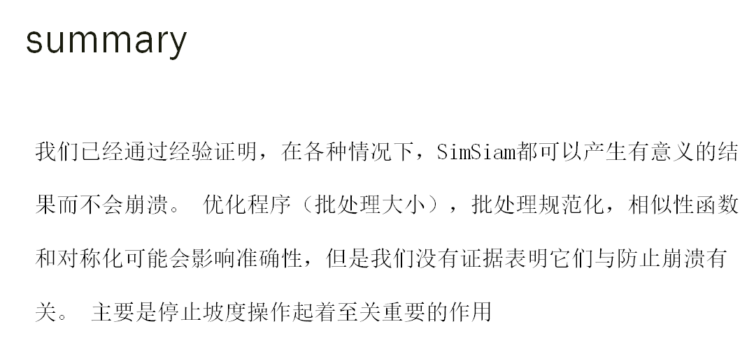 作者认为,孪生体系结构可能是相关方法(BYOL MOCOSIMclr)共同成功的重要原因。 孪生网络可以自然地引入归纳偏差来建模不变性,因为按定义“不变性”意味着对同一概念的两次观察应产生相同的输出。权重共享Siamese网络可以对不变性进行建模。 更复杂的转换(例如增强)。 我们希望我们的探索将激励人们重新思考孪生体系结构在无监督表示学习中的基本作用。