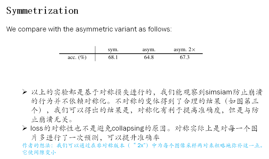 答案:loss的对称性也不是避免collapsing的原因。对称实际上是对每一个图片多进行了一次预测,可以提升准确率