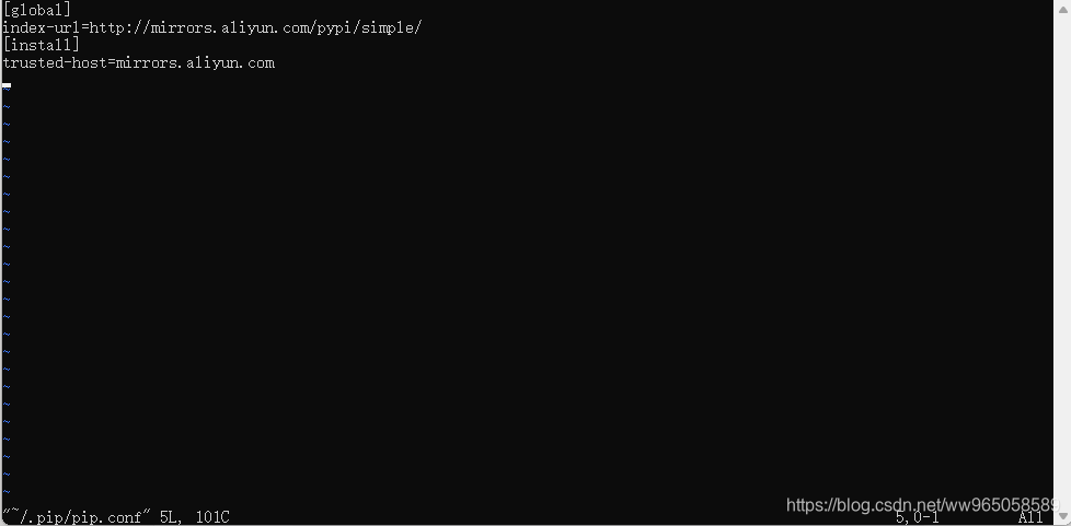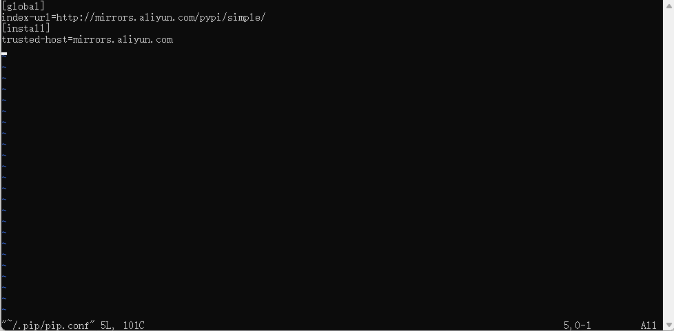 mkdir ~/.pip touch ~/.pip/pip.conf vim ~/.pip/pip.conf [global] index-url=http://mirrors.aliyun.com/pypi/simple/ [install] trusted-host=mirrors.aliyun.com