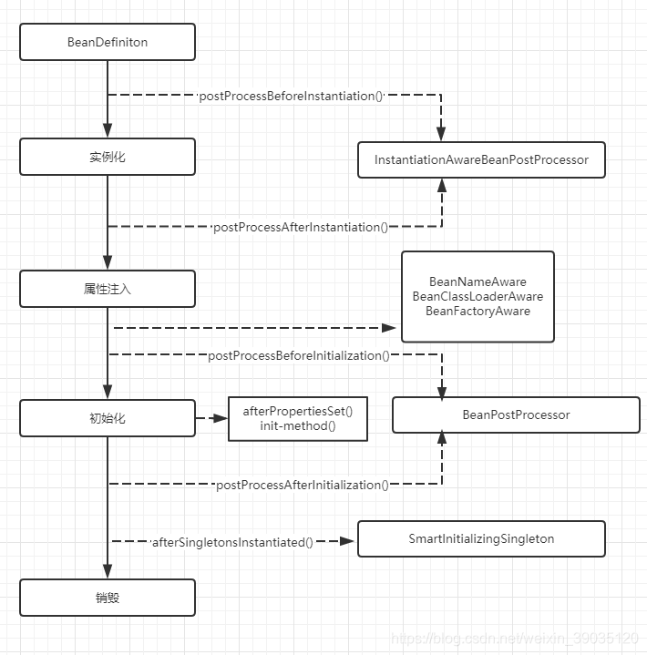 在一个 bean 实例被初始化时,需要执行一系列的初始化操作以达到可用的状态。同样的,当一个 bean 不在被调用时需要进行相关的销毁操作,并从 bean 容器中移除。