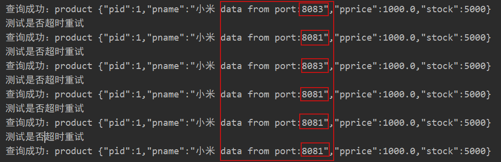 5.当我再次重复访问地址:http://localhost:8082/save?pid=1&uid=1的时候,发现在随机访问端口为8081和8083的两个product-service服务,证明上面配置的RandomRule策略是起作用了