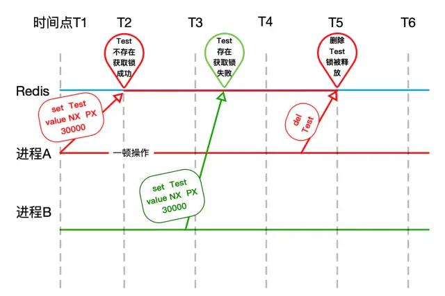 上图是笔者画的setnx大致原理,主要依托了它的key不存在才能set成功的特性,进程A拿到锁,在没有删除锁的Key时,进程B自然获取锁就失败了。