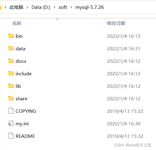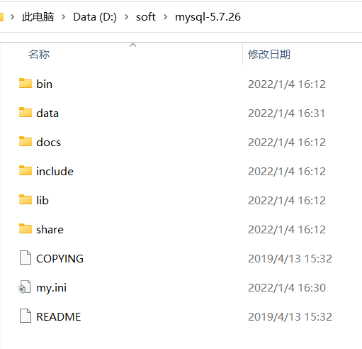 下载完成的文件,解压到windows下的安装目录。比如解压到d:\soft\mysql-5.7.26。