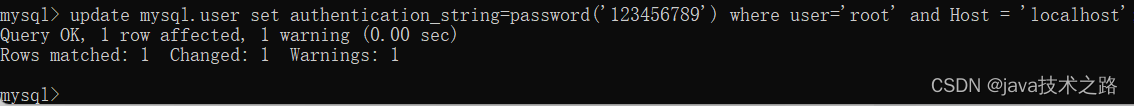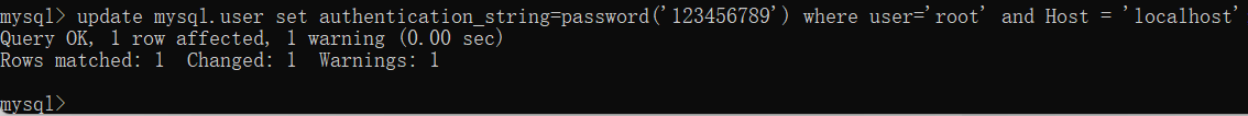 update mysql.user set authentication_string=password('123456789') where user='root' and Host = 'localhost';