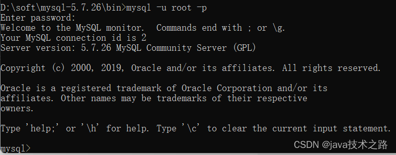 8、用命令 mysql –u root –p 进入mysql管理界面(密码可为空)