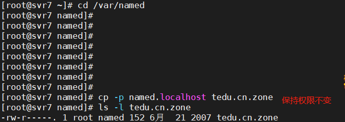 [root@svr7 named]# cp -p named.localhost tedu.cn.zone