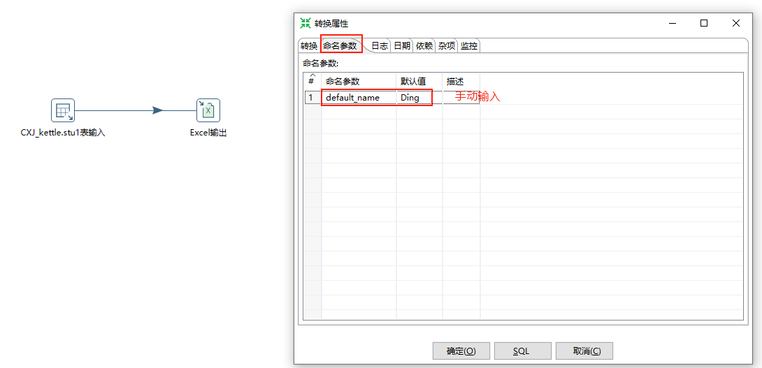 转换命名参数就是在转换内部定义的变量,作用范围是在转换内部。在转换的空白处双击左键,在转换属性中能看到“命名参数”。