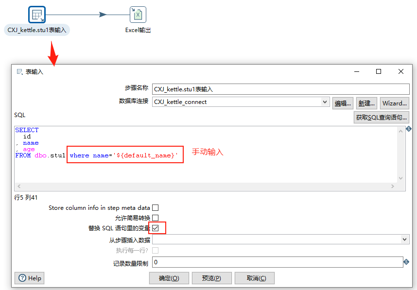 引用:可以在表输入SQL语句中使用${变量名} 或者 %%变量名%%