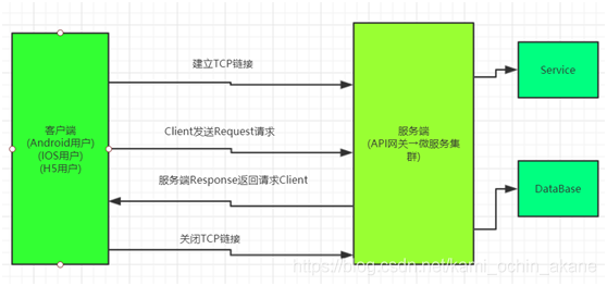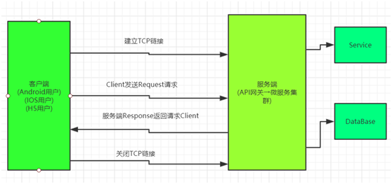 客户端发送网络请求→API网关,网关可能部署在(阿里云,Apache,IIS,nginx等)→再到后端服务services(可能存在多层级的服务)→servies去再数据库(大数据)获取数据→数据返回给客户端,http默认是持久连接