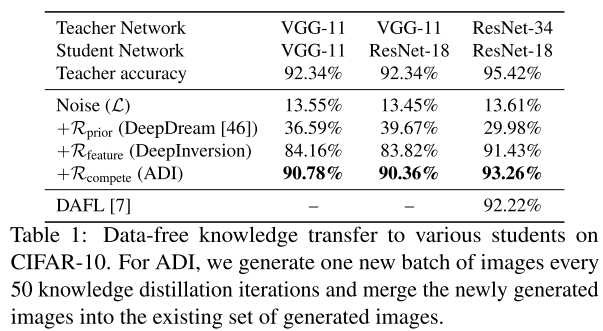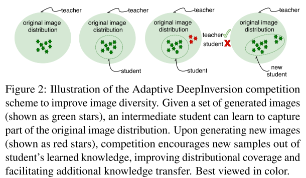 - 提出了DeepInversion,用于为分类模型合成class-conditioanl的图像。此外,通过Adaptive DeepInversion来利用学生与教师的分歧,提高合成图像的多样性。