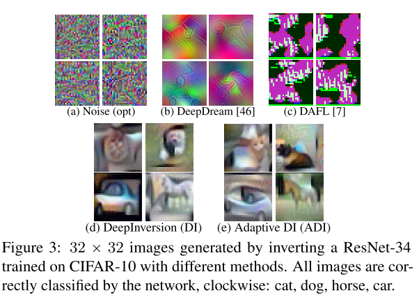 该文章提出了DeepInversion,利用已训练的模型合成高分辨率、高保真度的训练图像。此外,使用Adaptive DeepInversion,通过迭代的方式提高了生成图像的多样性。