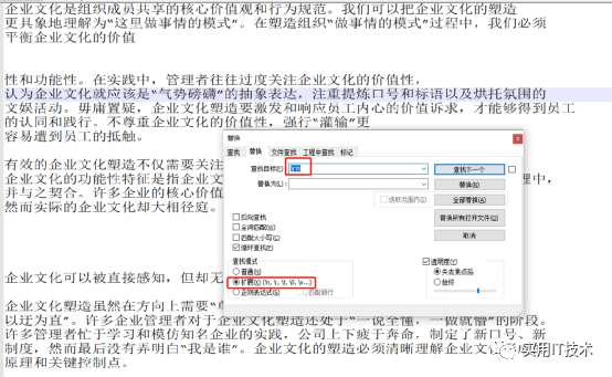小明:“这也好办。在【替换】对话框中,【查找目标】中输入【([^。!”])(\r\n)+】,【替换为】中输入【$1】。再点击【全部替换】。”