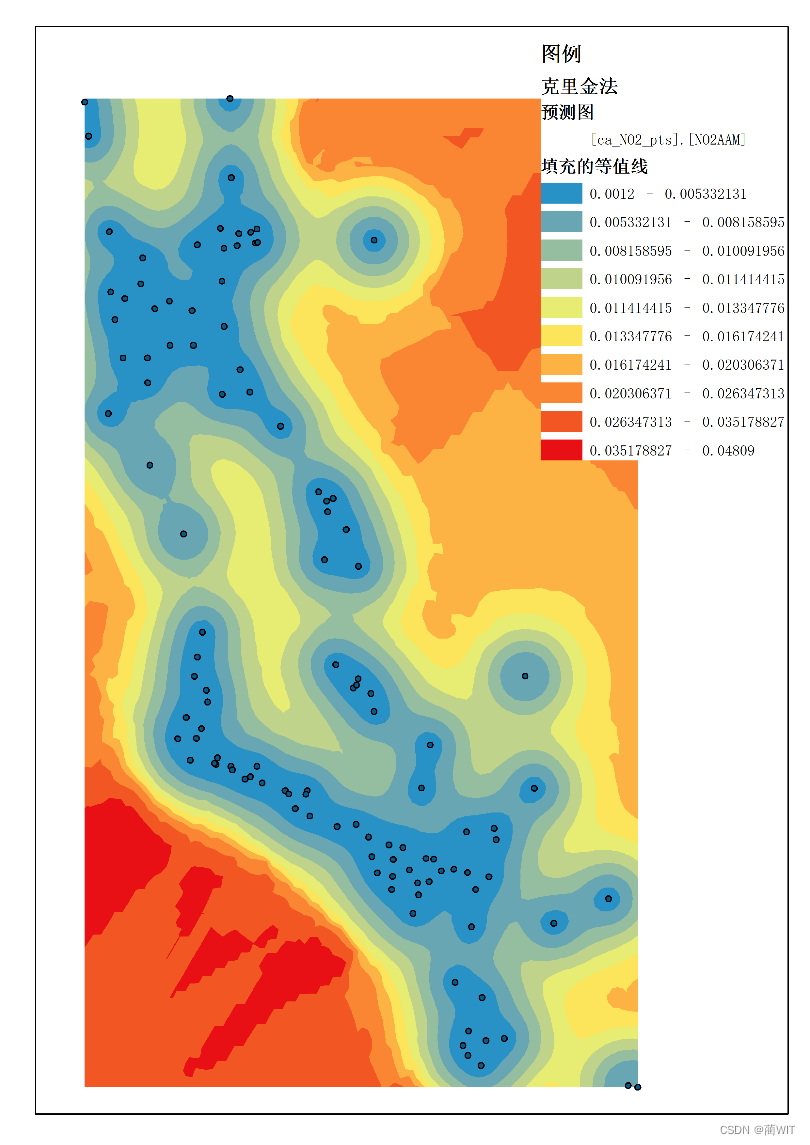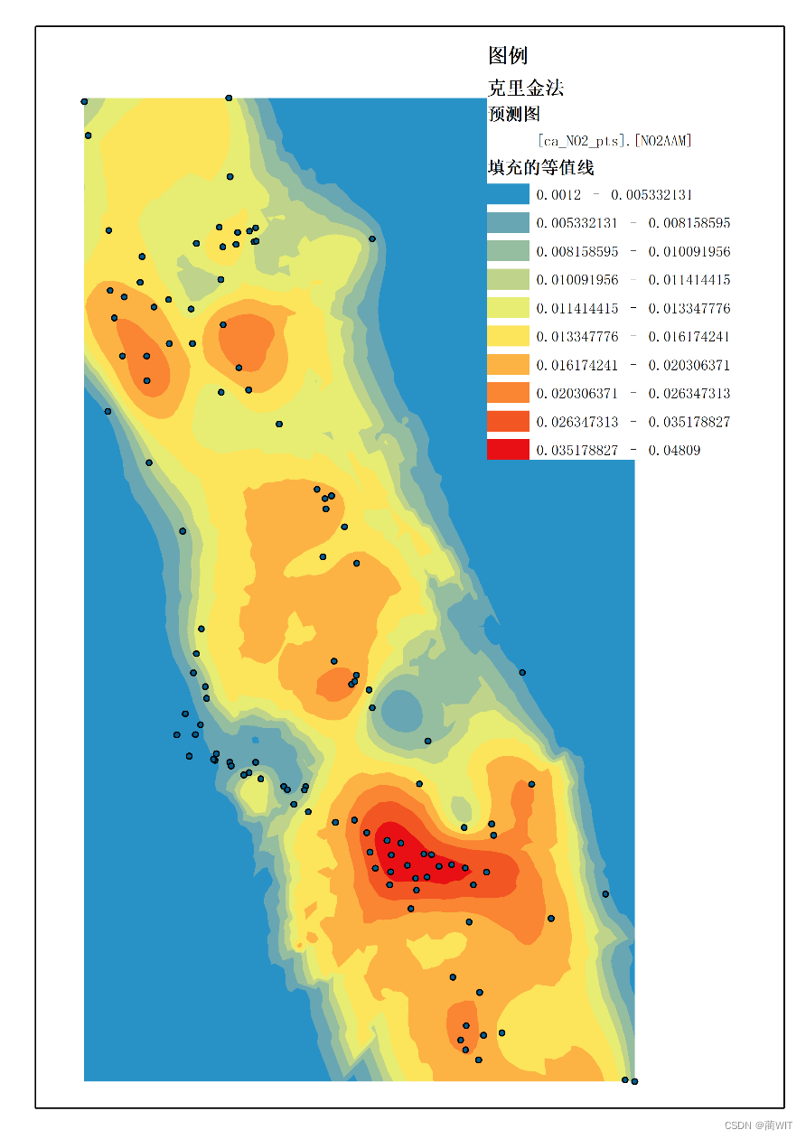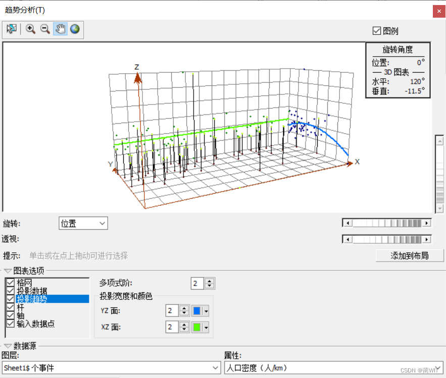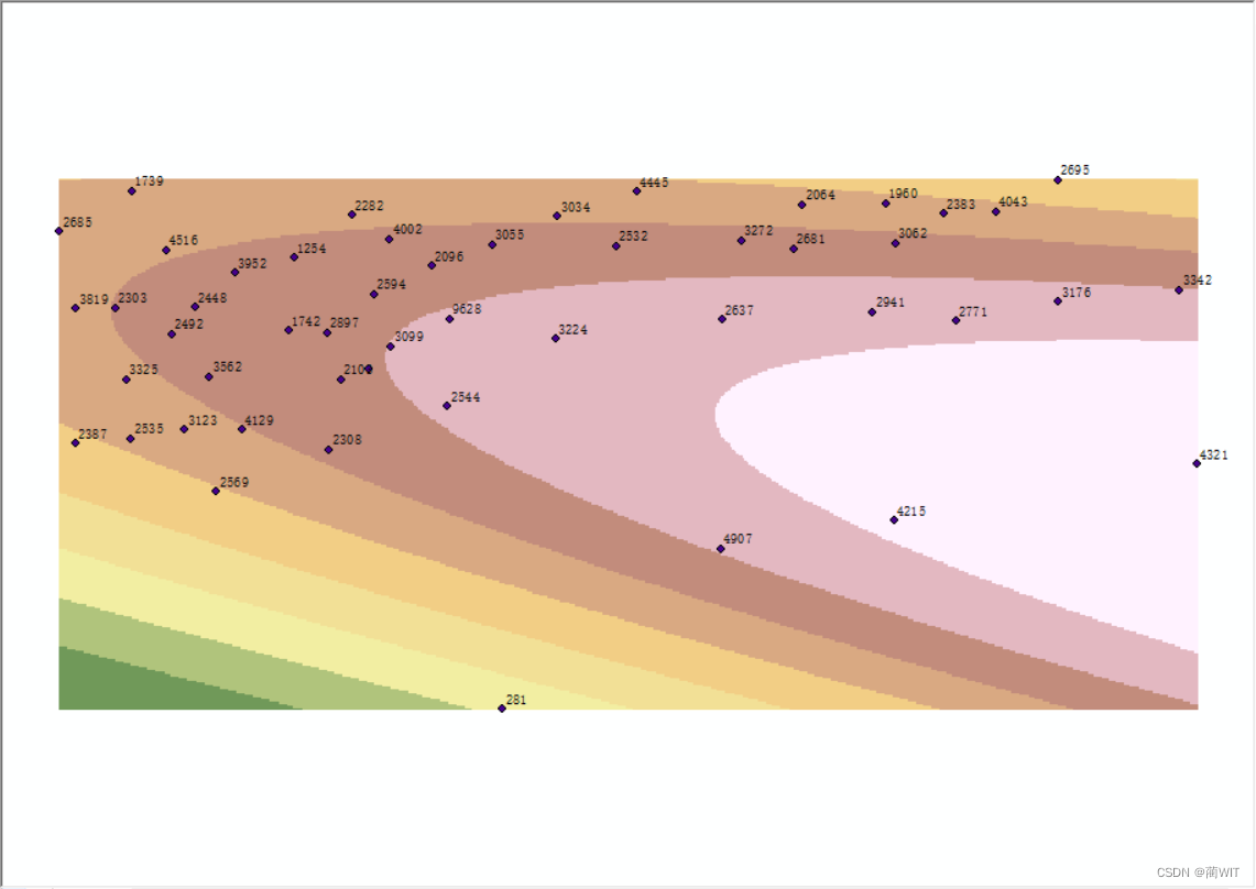 - 从上面趋势面插值图可以直观看出,其人口密度分布趋势与前面“趋势分析”结论相符合:南北方向具有较明显的趋势。