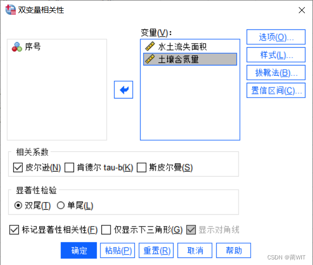 - 在变量栏中选中所要求的变量,将选择的变量移到“变量”矩形框中;从主对话框中选择“相关系数”的方法,系统默认的是Pearson,即皮尔逊相关(常用的一种方法)。显著性检验系统默认的是Tow-tailed,即双尾T检验,表示相关系数为0的假设检验成立的概率。如果是先不知道相关方向时选用Tow-tailed;如果事先知道方向时,选用One-tailed。