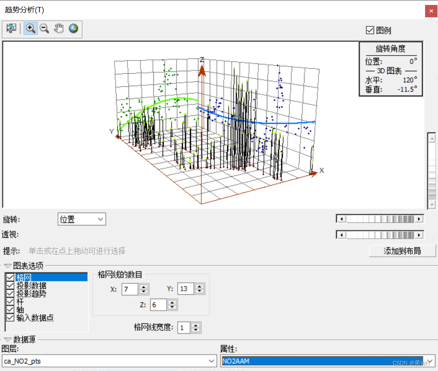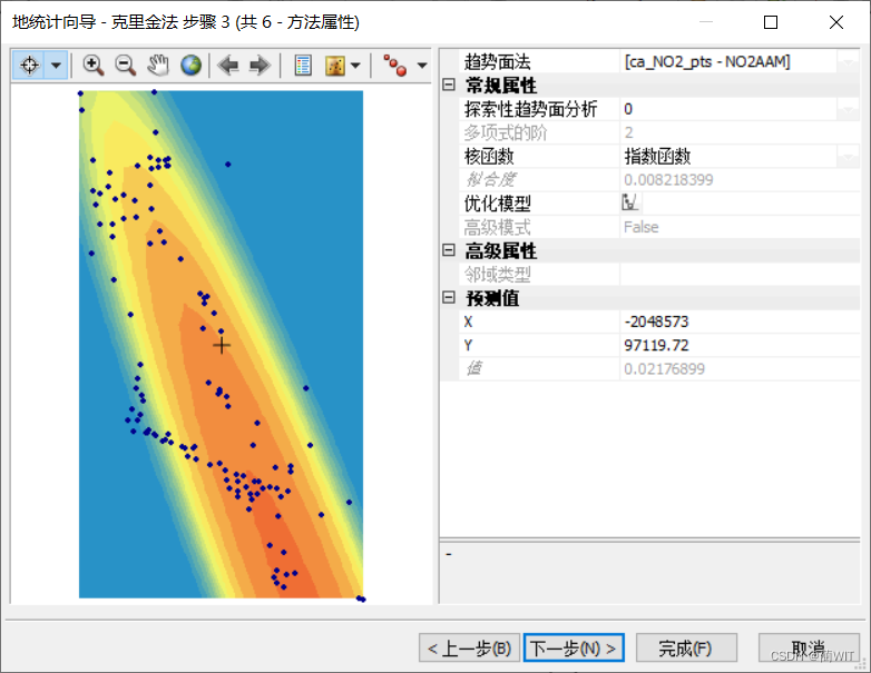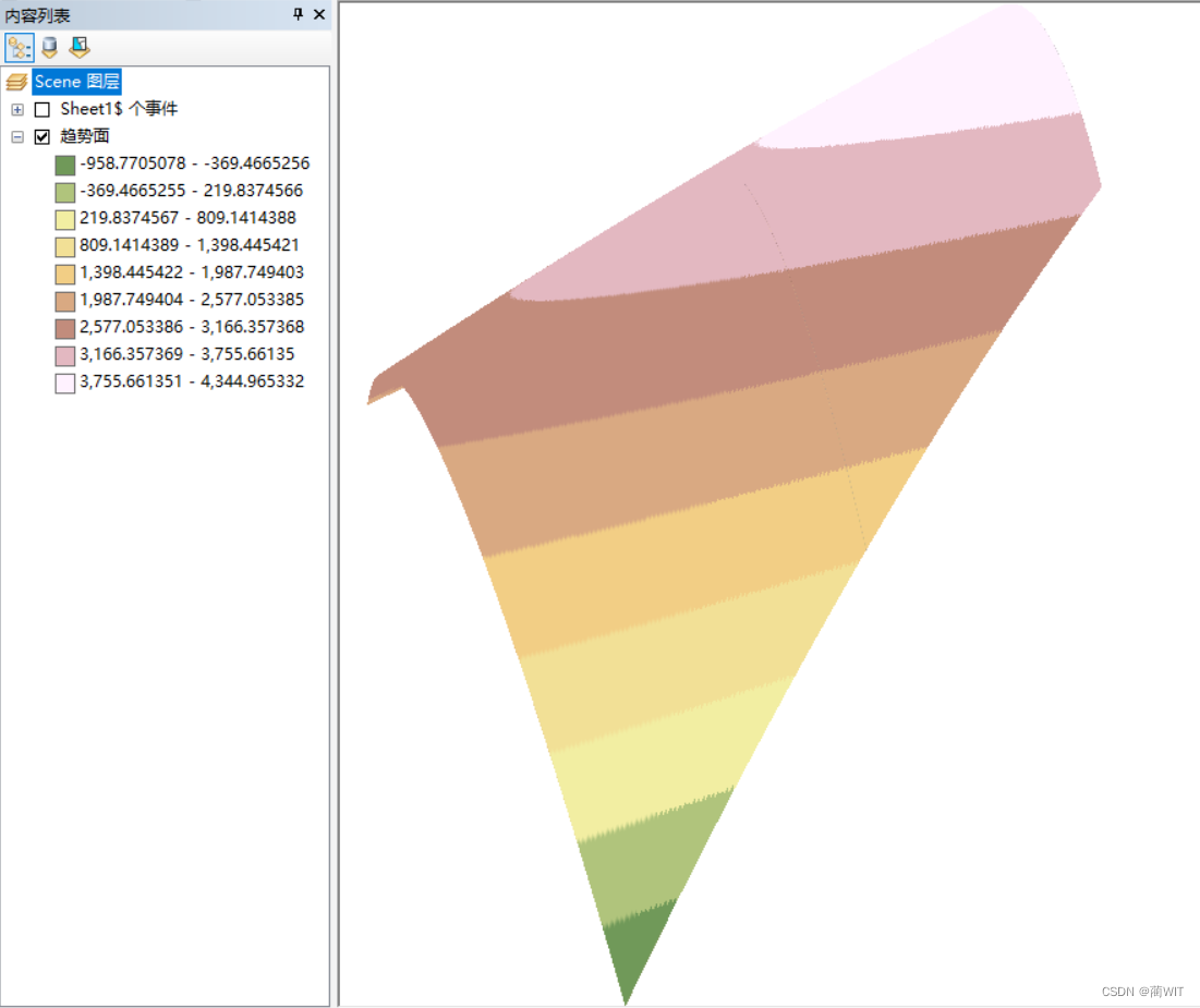 2、进行趋势面插值分析。利用ArcCatalog工具箱中的【趋势面分析】工具创建趋势面图层,进一步进行分析与检验。