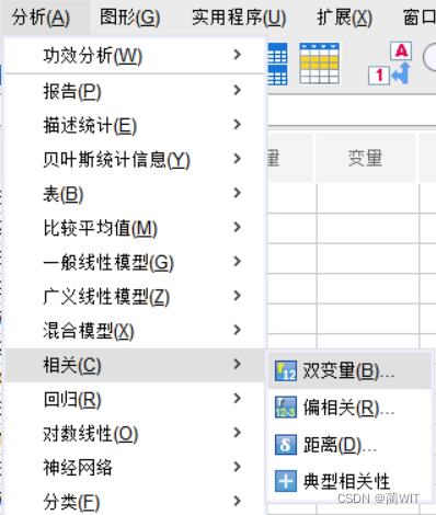 3、计算简单相关系数。点击“分析”→“相关”→“双变量”,展开双变量相关性分析对话框。