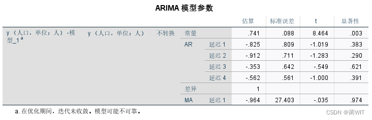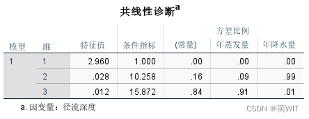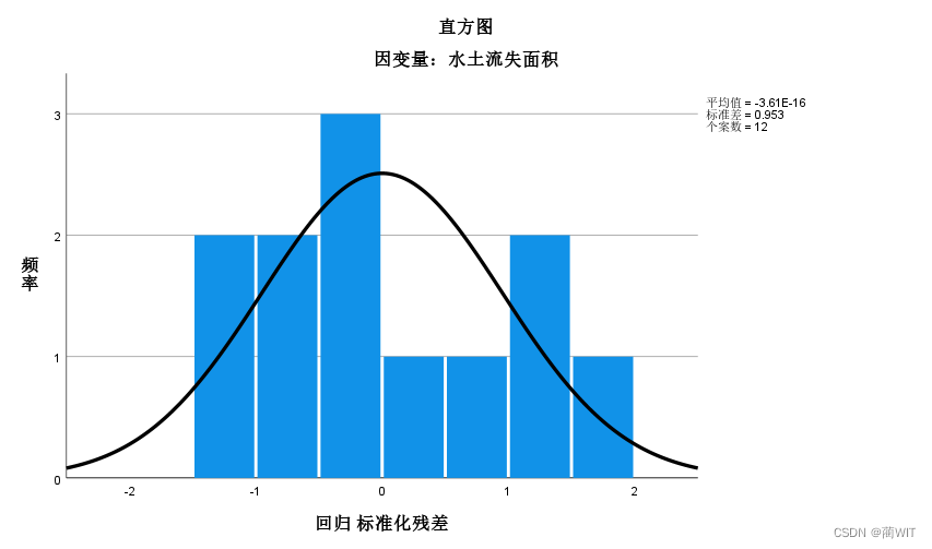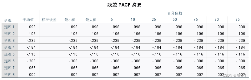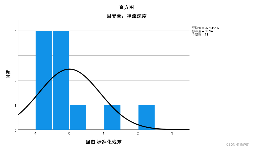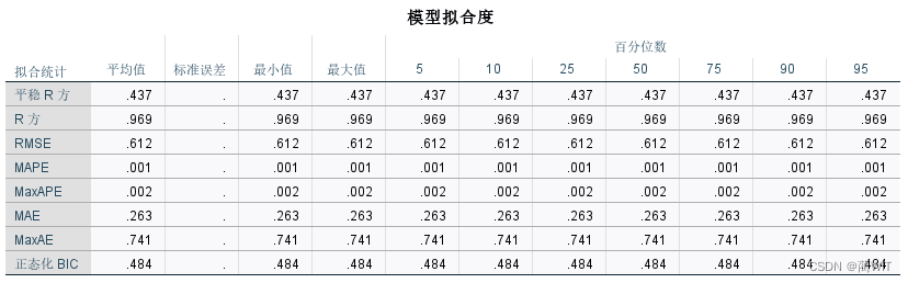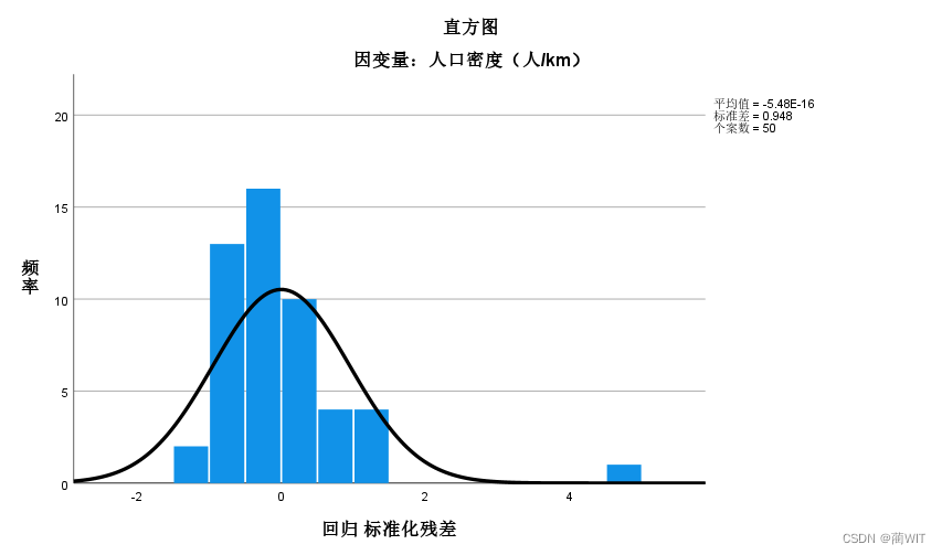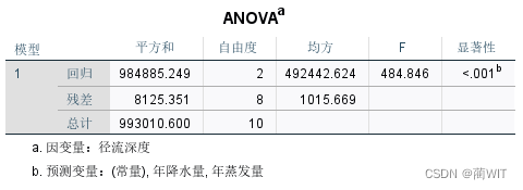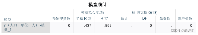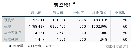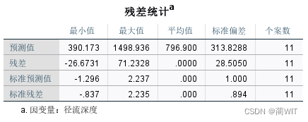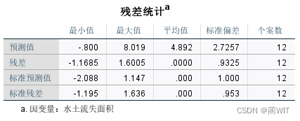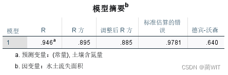 - 标准误差检验。在模型摘要中可以读出标准离差(误差)s=0.9781.在残差统计表中可以给出了因变量y的均值:y_=4.892,两者相除可得变异系数ơ=0.1999。