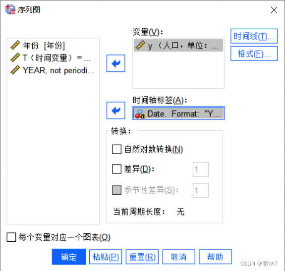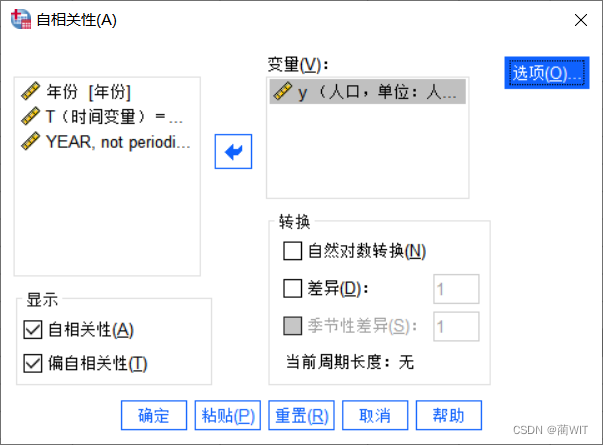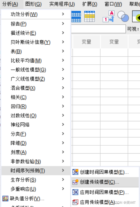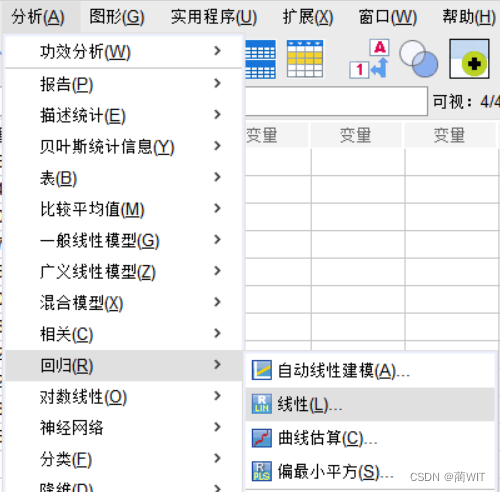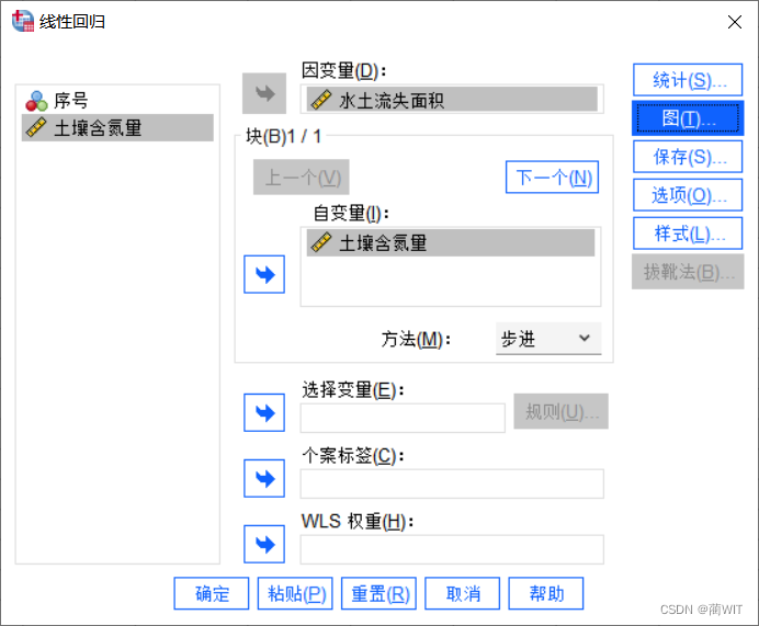 5、建立一元线性模型。由上述散点图和相关分析结果,可知数据具有趋势性,可对其进行一元线性回归拟合。选择“分析”→“回归”→“线性”,打开“线性回归”对话框。