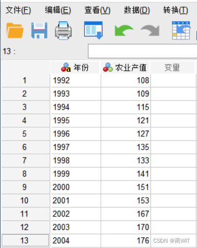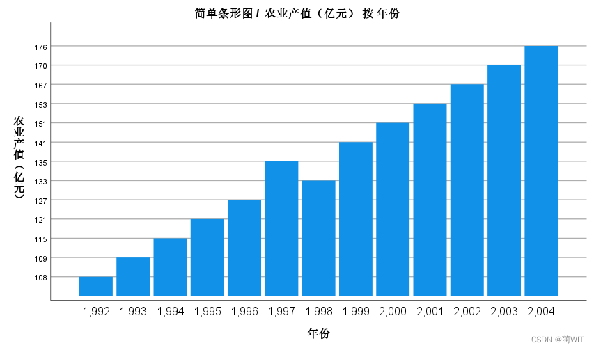 5、绘制数据的条形图,可以直观看出逐年份的农业产值增长情况,点击“图形”→“图表构建器”,可进行构建图表的选择与相关设置。