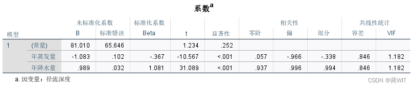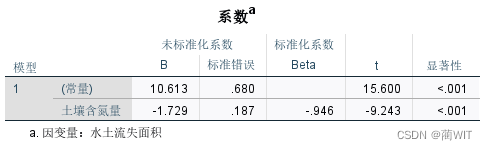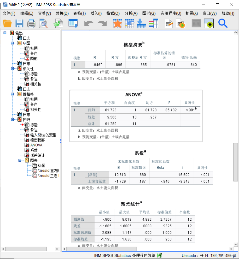 - 回归系数。如图2-14,可以读出回归系数:截距a=10.613,斜率b=0.680。
