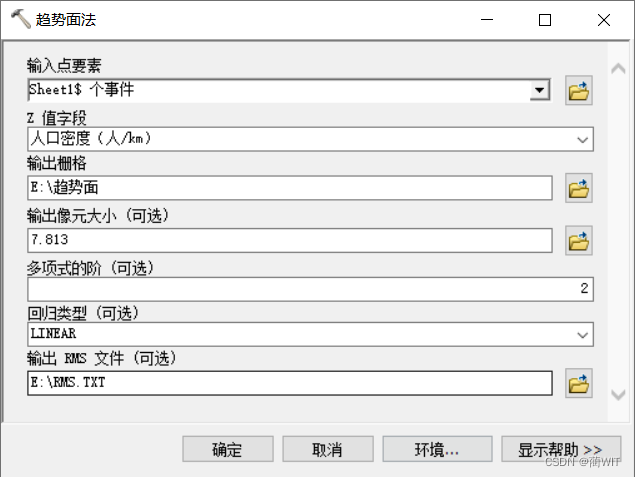 - 使用趋势面法将点插值成栅格表面。这里的Z值字段为存放每个点的高度值或量级值的字段,选择“人口密度”;多项式的阶数设为:2(二阶多项式);回归类型选择:LINEAR—对输入点进行最小二乘曲面拟合,这种类型适用于连续型数据。选择输出RMS文件:包含插值的 RMS 误差和卡方相关信息的输出文本文件的文件名。