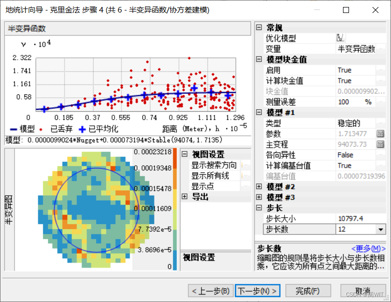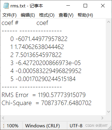 - 在如图9-7的RMS文件中,可以看出其采用的二阶多项式的六个系数,即0到5对应的值,以及插值的RMS误差:1190.57773915079,卡方相关信息:70873767.6480702。据此可以写出其二阶趋势面模型: