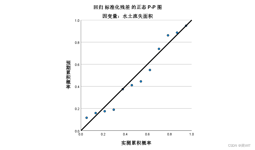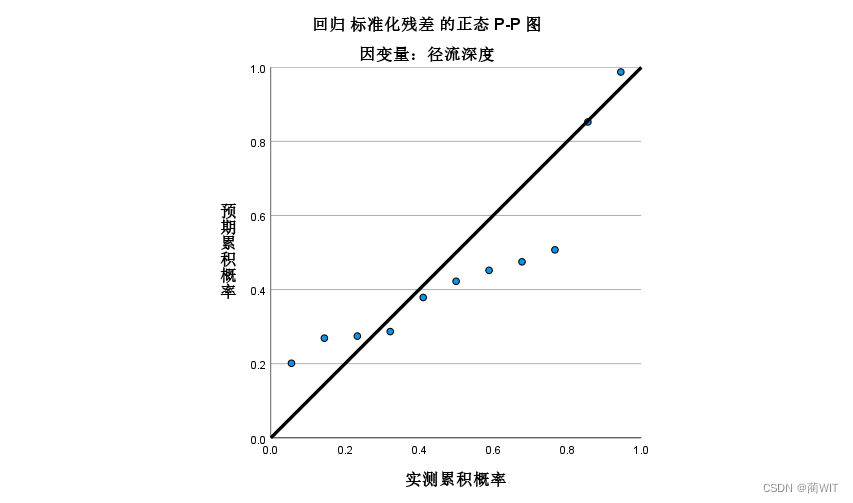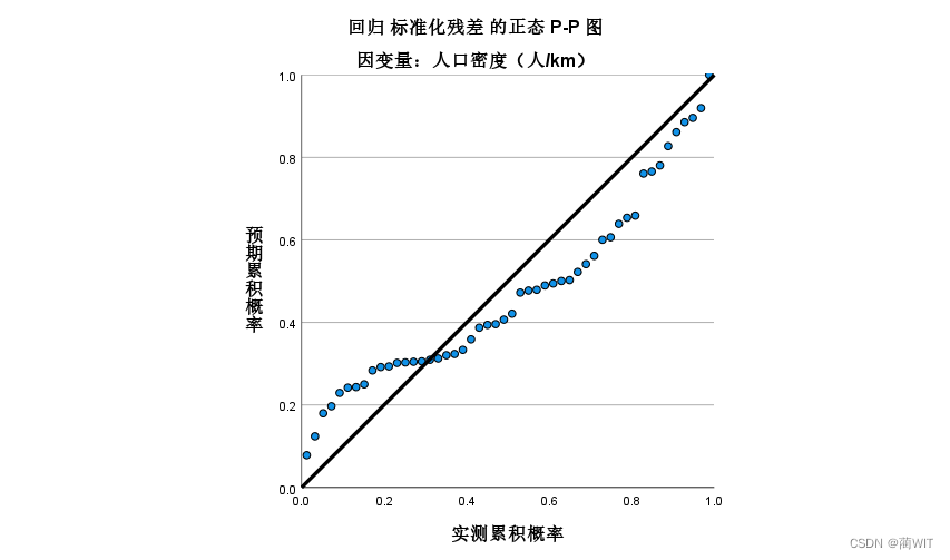 - 在Output 中可以观察残差分布的正态概率图(应该呈现正态分布特征,图2-18)及其累计图(应该形成对角直线,图2-19)。残差分布概率越是具有正态分布即钟形曲线(bell-like curve)特征,表明残差分布越是随机,回归结果越是可靠。残差分布的累计概率越是接近对角线,表明残差分布越是随机,回归结果越可靠。