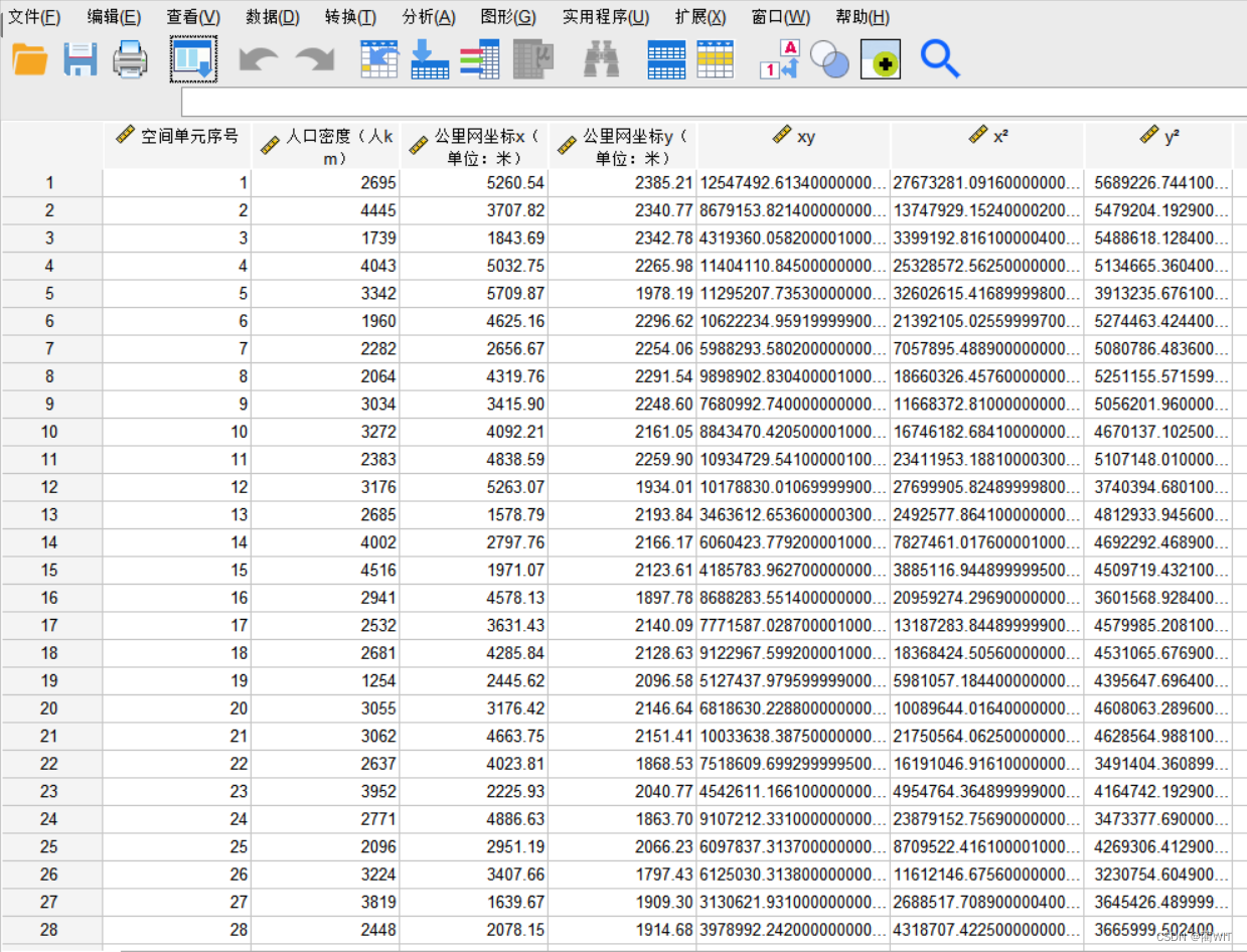 3、利用SPSS进行趋势面回归分析。先算出x²,y²,xy作为变量,进行多元线性回归分析,计算二阶回归方程,同时进行误差诊断与评估。